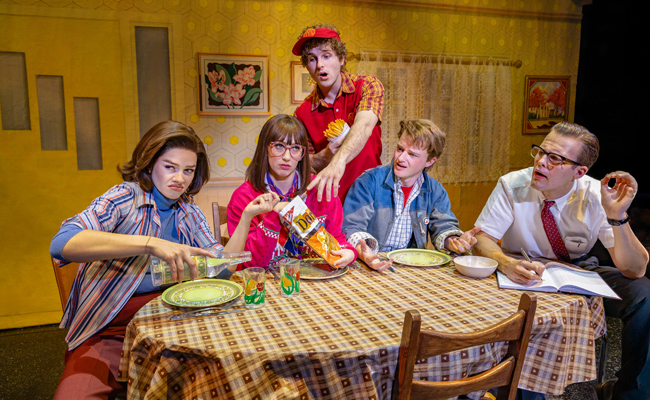 As you may know, Back to the Future: The Musical is based on the classic 1985 comedy film directed by Robert Zemeckis and produced by Stephen Spielberg, in which 17-year-old Marty McFly accidentally travels to 1955 after his friend Doc Brown ends up with a nasty case of plutonium poisoning, Marty racing to the hospital in Doc’s newly invented DeLorean time machine that kicks into gear when it hits 88 mph. Instead of arriving at the hospital, Marty arrives where he started but thirty years earlier, and his presence in the past creates complications that could affect his very existence in the future. And the biggest complication is that instead of his father, George, falling out of a tree and being rescued by the man who will be his grandfather, George falls on Marty and he is the young man who ends up catching the eye of Lorraine … who will be his mother. After seeing Marty in his purple underwear and thinking his name is Calvin Klein, Lorraine only has eyes for him, and unless Marty can get George and Lorraine to kiss at the Enchantment Under the Sea school dance, he and his siblings will be erased from existence.
