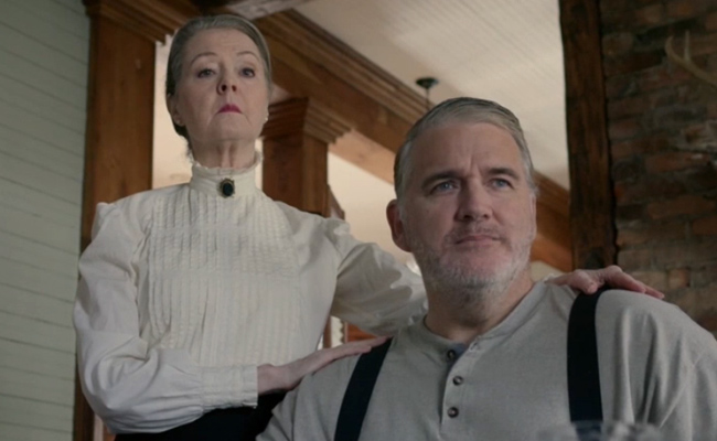 Things begin to get more weird by the day, and night (Evelyn begins drugging the water at dinnertime to make the family sleepy for some reason), and Max notices that Grant keeps calling him ‘Johnny’. Grant brushes it off by saying back in the old days they called everyone Johnny. Uh, sure. As luck would have it, Sadie finds a job opening that fits her skill set (school administrator) and books an interview. To celebrate, Grant and Evelyn take Sadie and the kids out to a local diner for dinner — a real family dinner — and Grant gives Sadie an envelope. Inside is an amended will leaving the home and property to Sadie — no strings attached — with which she can do anything she wants, even sell it to help with her money problems. The time comes for Sadie to head to the city, but right before she leaves, Grant is tinkering under the hood of her car, making sure all is well for her long trip, and before she can get out of the driveway she nearly runs Jake over. He’s there with another warning to not leave her kids alone with the couple but she has to get to her interview. Jake promises to watch over them like they were his own kids … and promptly walks back to his farm where he can’t possibly see anything. Thanks, Jake. While Evelyn and Grant are otherwise occupied, Max and Olivia pick the lock to the attic door and make a shocking discovery — an old bed frame with chains and shackles. They also find old photos of Grant and Evelyn and a young boy, obviously named Johnny. But before they can both make it out of the attic, Grant and Evelyn return. Olivia escapes and Max has to make his way out of the open window in the attic, getting to the ground just as Grant was rounding the corner of the house but he tells Grant he was just looking for something to sharpen the sickle.
