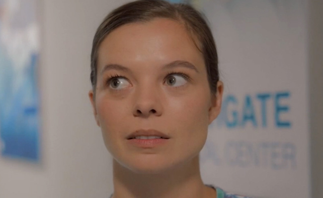Now, here is where we have to question if acting choices were made by the actors or the director. Juliette Schroeder is totally shady as Zara’s friend Keira. Why she treats Betty so poorly is never really explained. Perhaps it’s because she’s just trying to protect Zara’s secret about having a boyfriend, but she just comes off as mean and uncaring that Zara is missing. She only finally lightens up when she hands over the letters, but she’s already rubbed Betty and the audience the wrong way by that point. So was it her choice to play the role like that or did Boisvert suggest she play the role like that? Also questionable is the performance of Alexandra Petrachuk as Nurse Carine. Every question she asks Zara seems like she is trying to get information out of her to relay back to Patrick. She never seems sincere in wanting to help Zara, she is just pumping her for info. And when the sheriff arrives to ask some questions, Nurse Carine lurks in the doorway again like she is trying to find out something to use against Zara. It’s not until Patrick shows up as a cop and Zara pretends she’s not feeling well that we see she is helping Zara … but even in that moment we still wonder if Zara should be trusting her (the scenes is quite hilarious, unintentionally, as an army of hospital personnel swarm into the small bathroom in Zara’s hospital room while Patrick watches, and then Zara is wheeled out on a gurney like she’s dead!). It just bugged me that she had to behave so oddly unnecessarily when she could have just been the friend Zara needed in that moment (I mean, she was to Zara, even bringing her some clothes, but to the audience she seemed untrustworthy).